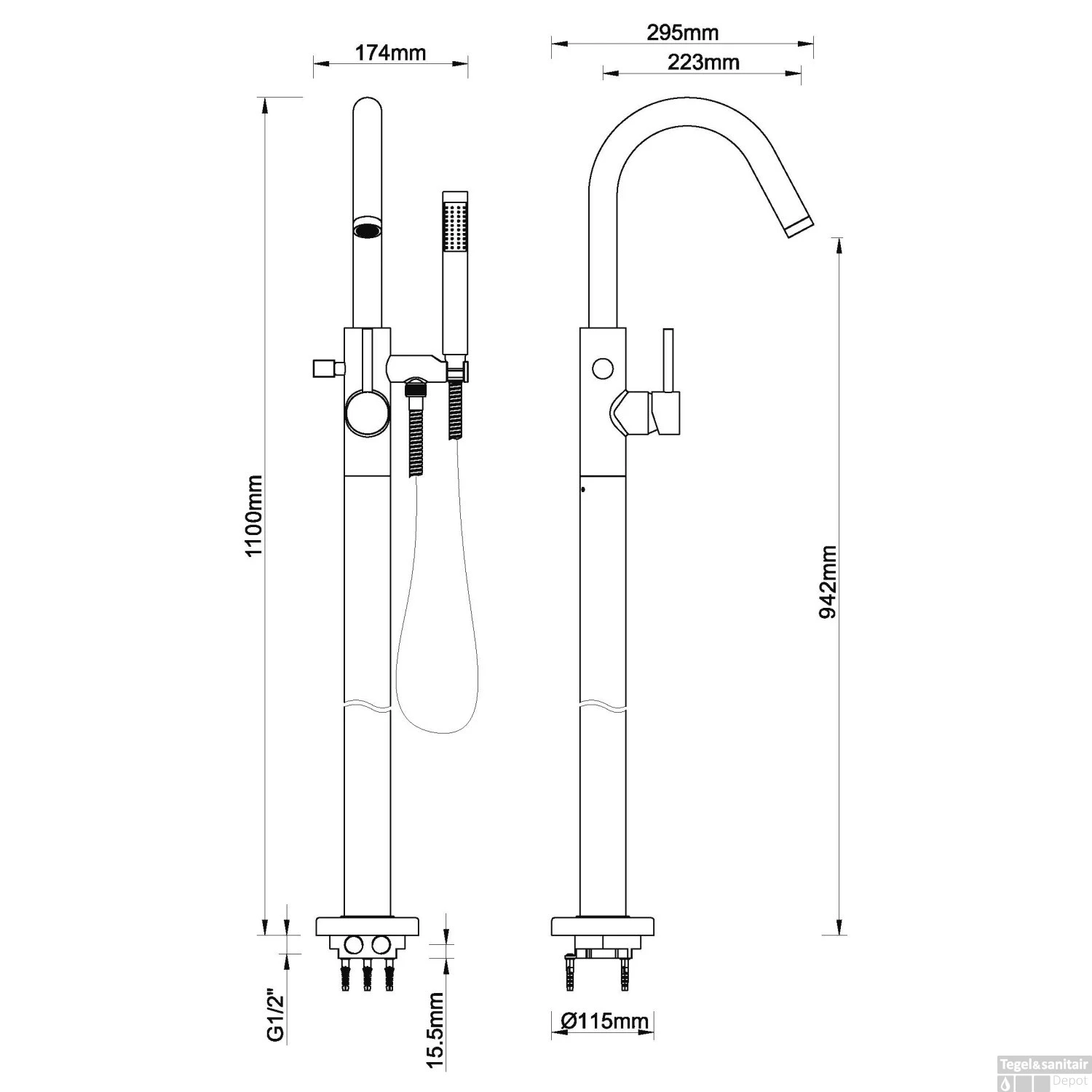 Deze vrijstaande Caral badmengkraan is van het populaire merk Wiesbaden en staat garant voor kwaliteit en design. Het betreft een complete set bestaande uit een badkraan, een handdouche en een doucheslang. Alle elementen van deze set zijn afgewerkt in de kleur geborsteld messing, wat een luxe uitstraling aan uw badkamer geeft.