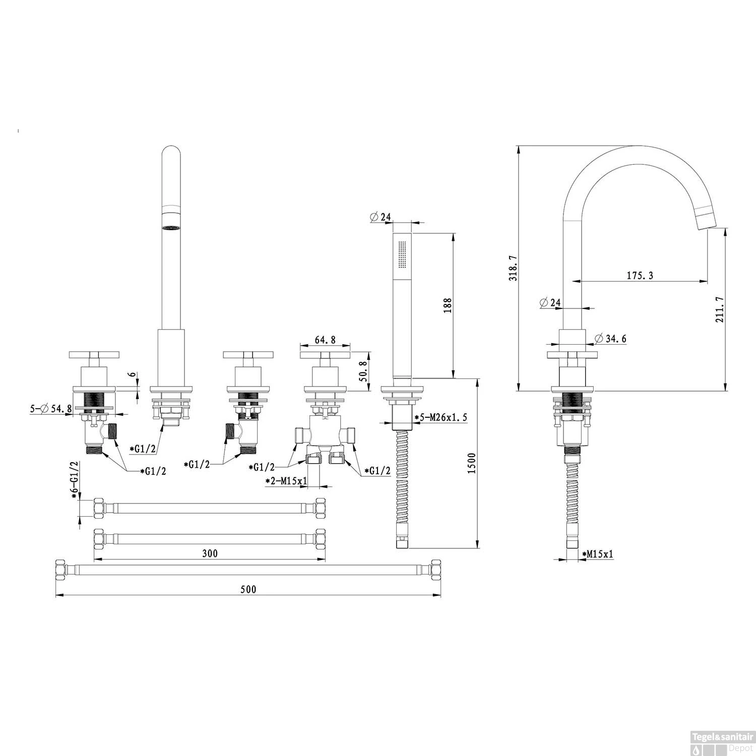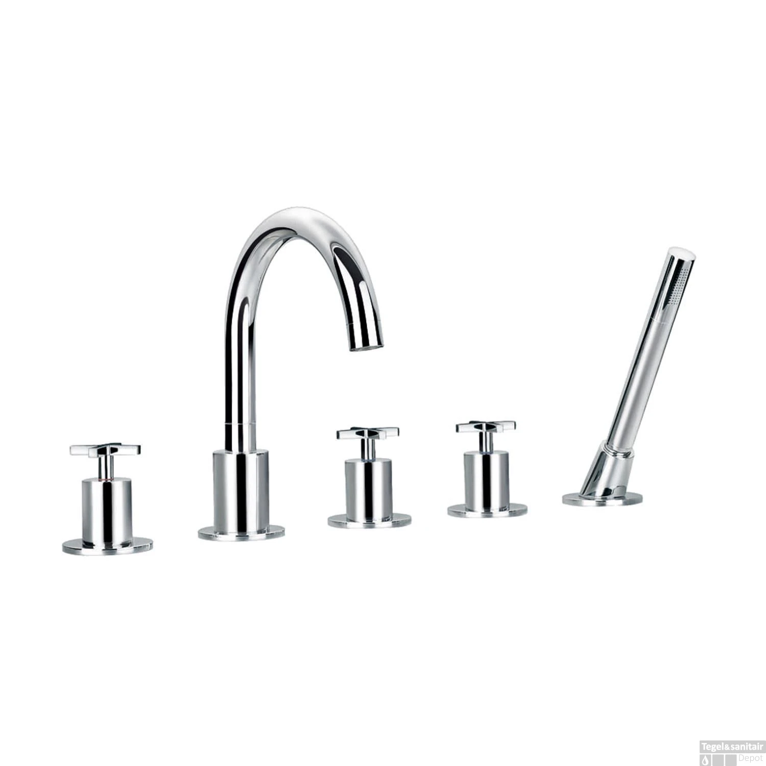 Deze 5-gats badrandkraan beschikt over drie kruisgrepen. De eerste verzorgt het warme water, de tweede het koude water en met de derde kruisgreep bepaalt u vanuit welke richting u het water wilt laten lopen: vanuit de uitloop of vanuit de handdouche.