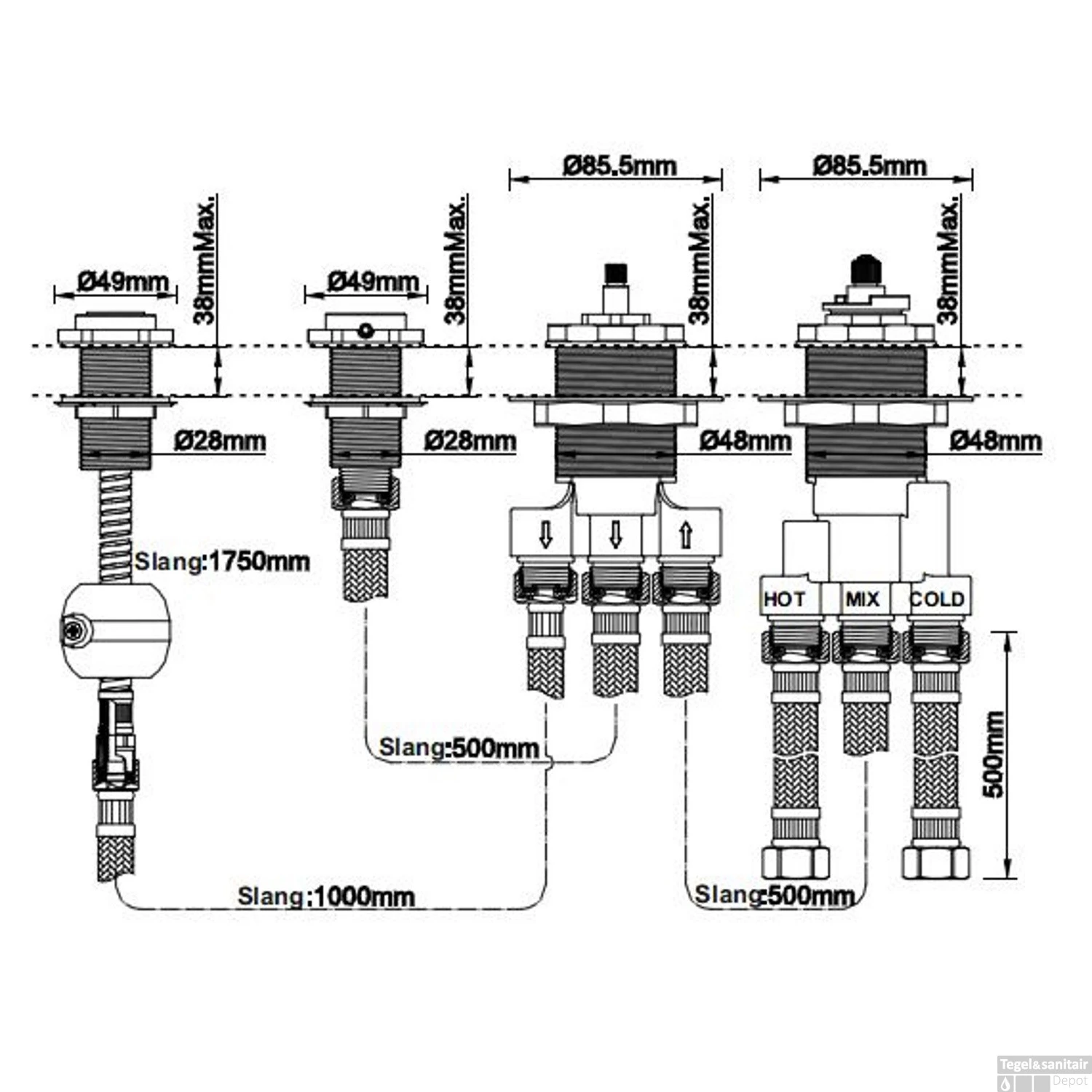 Deze badrandthermostaat is goed te combineren met de 4-gats afbouwsets Caral, Cross en Rombo van Boss & Wessing. Indien u dit wenst, vergeet deze dan niet bij te bestellen! Deze inbouw badrandthermostaat 4-gats bestaat uit een aansluiting voor een verzonken handdouche, een aansluiting voor een omstelknop en een thermostaatknop met blokkering op 38 graden en een uitloop aansluiting.