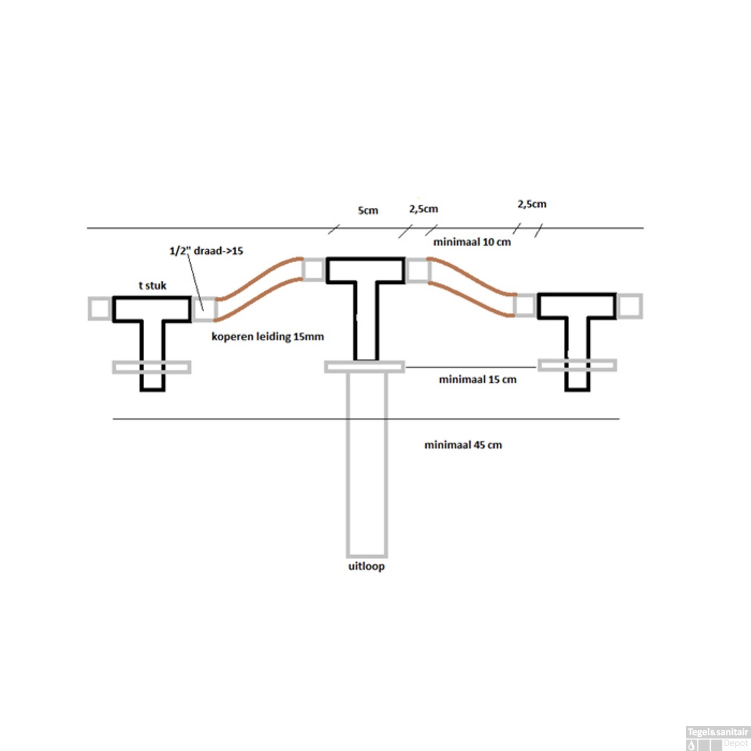 De hendels voor warm en koud water zijn links en rechts van de uitloop bevestigd.
