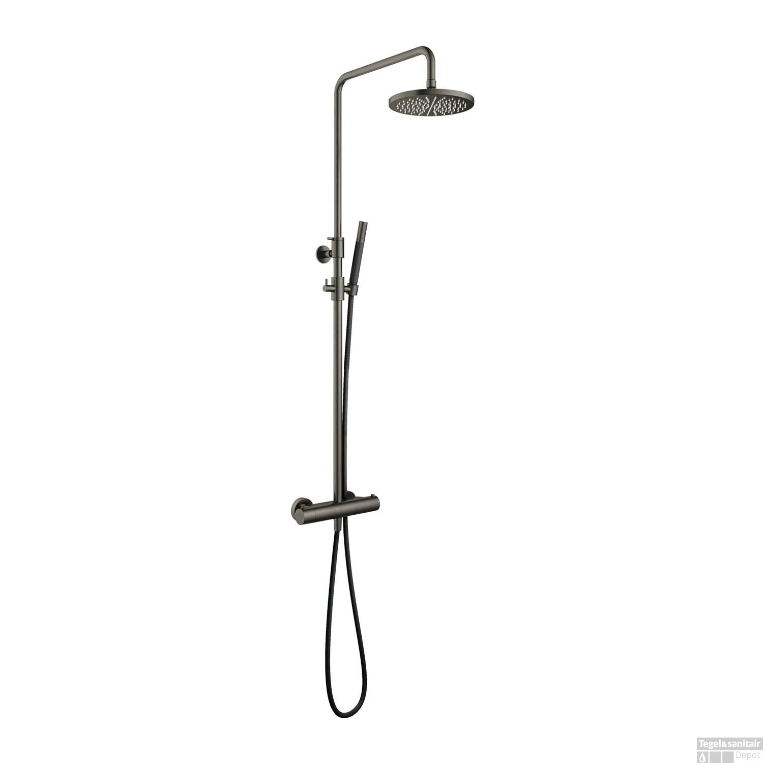 Deze Cobber set in de kleur Verouderd IJzer bestaat uit een opbouwthermostaat, doucheslang van 150 cm, een stortdouchestang, een luxe ronde handdouche en een ronde hoofddouche met een diameter van 20 cm. Bij deze set krijgt u een mooie ronde handdouche in plaats van de standaard staafdouche. Met de thermostatische kraan is de temperatuur makkelijk in te stellen. U kiest zelf hoe warm u het water wilt hebben.