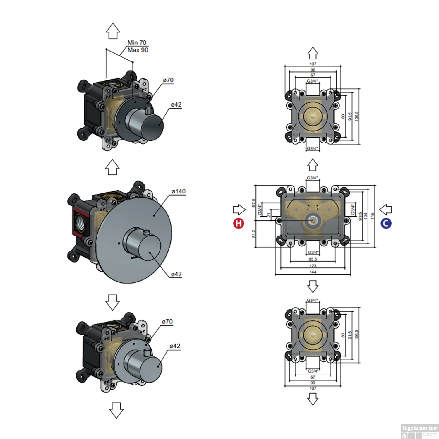 Specificaties Douchethermostaat Hotbath Buddy Inbouw 2 Stopkranen Chroom (excl. inbouwdeel):