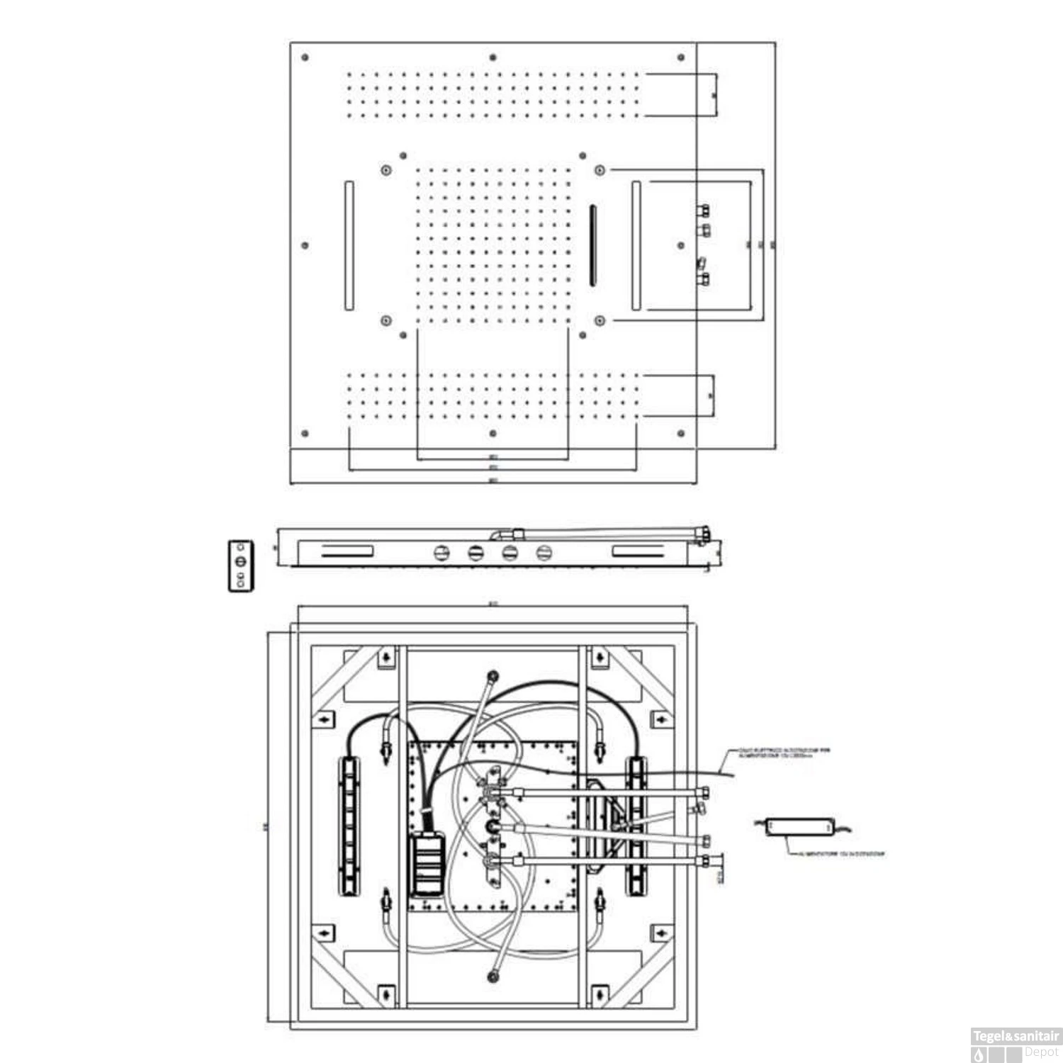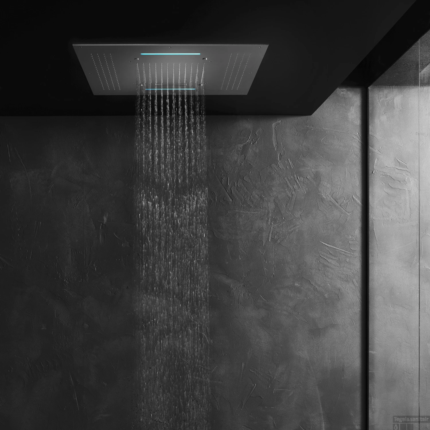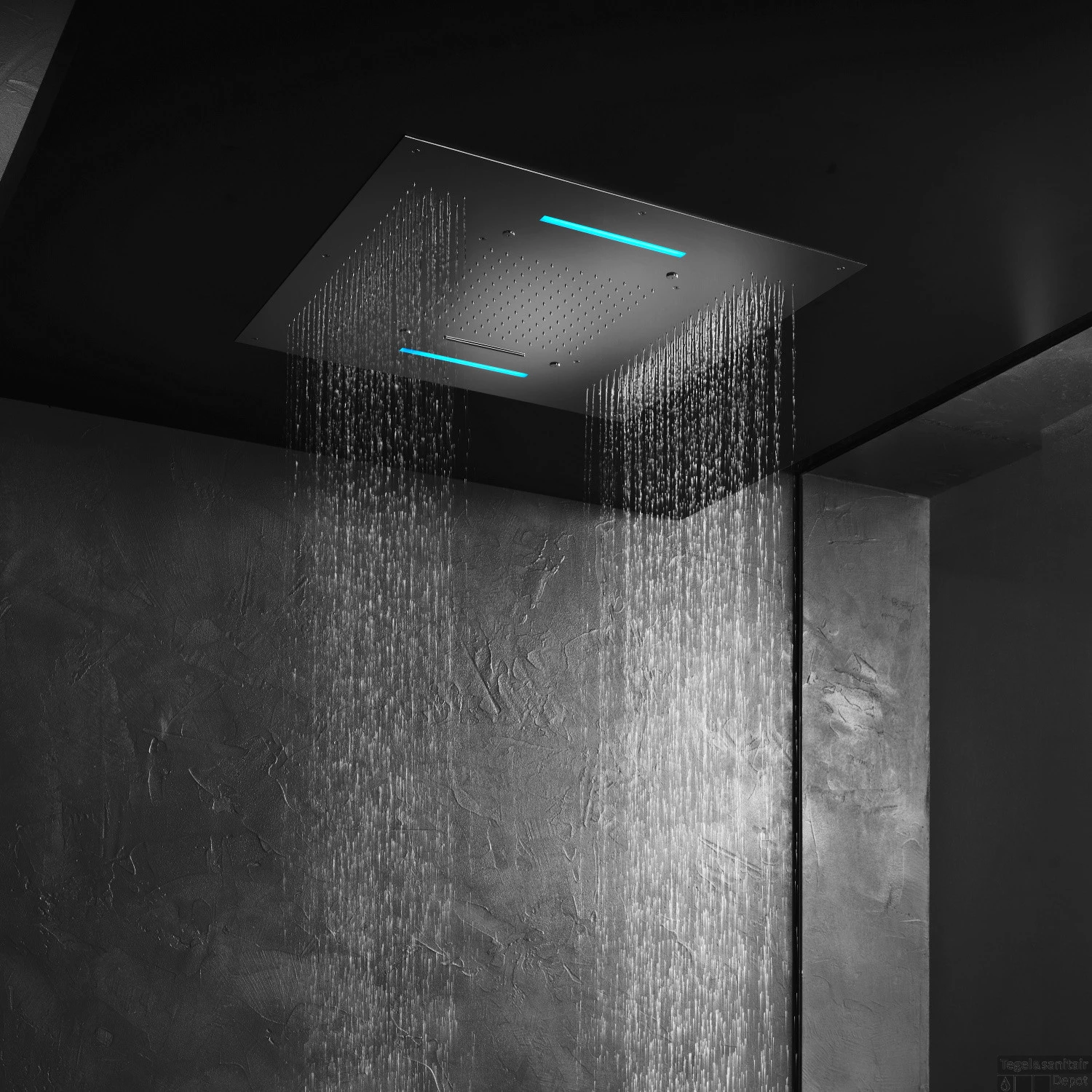 De hoofddouche is vierkant 95 bij 95 cm, heeft LED-verlichting met een bijbehorende afstandbediening. Voorzien van twee verschillende stortdouches, nevel en waterval. Inbouw inclusief frame.