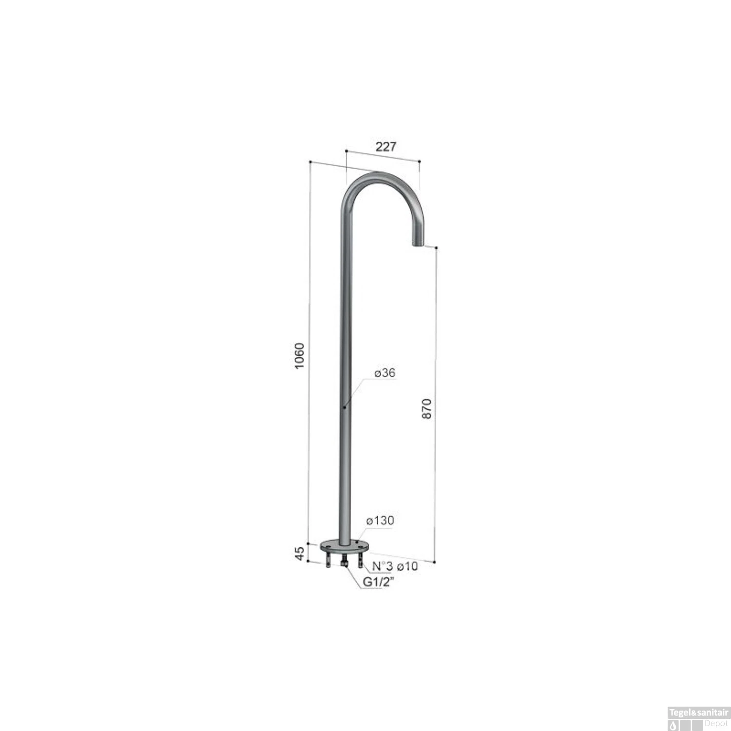 Deze vrijstaande baduitloop zorgt voor een strakke afwerking en een moderne look in uw badkamer. De kraan is geschikt voor vrijstaande baden en zorgt voor een luxe uiterlijk. De hoogte is 106 cm met een breedte van 22.7 cm. De hoogte van de uitloop is 87 cm. Let op bij de aansluiting van 1/2″ dient het buitendraad in de vloer geplaatst te worden. De diameter van de uitloop is 3.6 cm. Let op: dit is slechts de uitloop, u dient de kraan los bij te bestellen voor een meerprijs, dit is mogelijk onder aan de pagina.