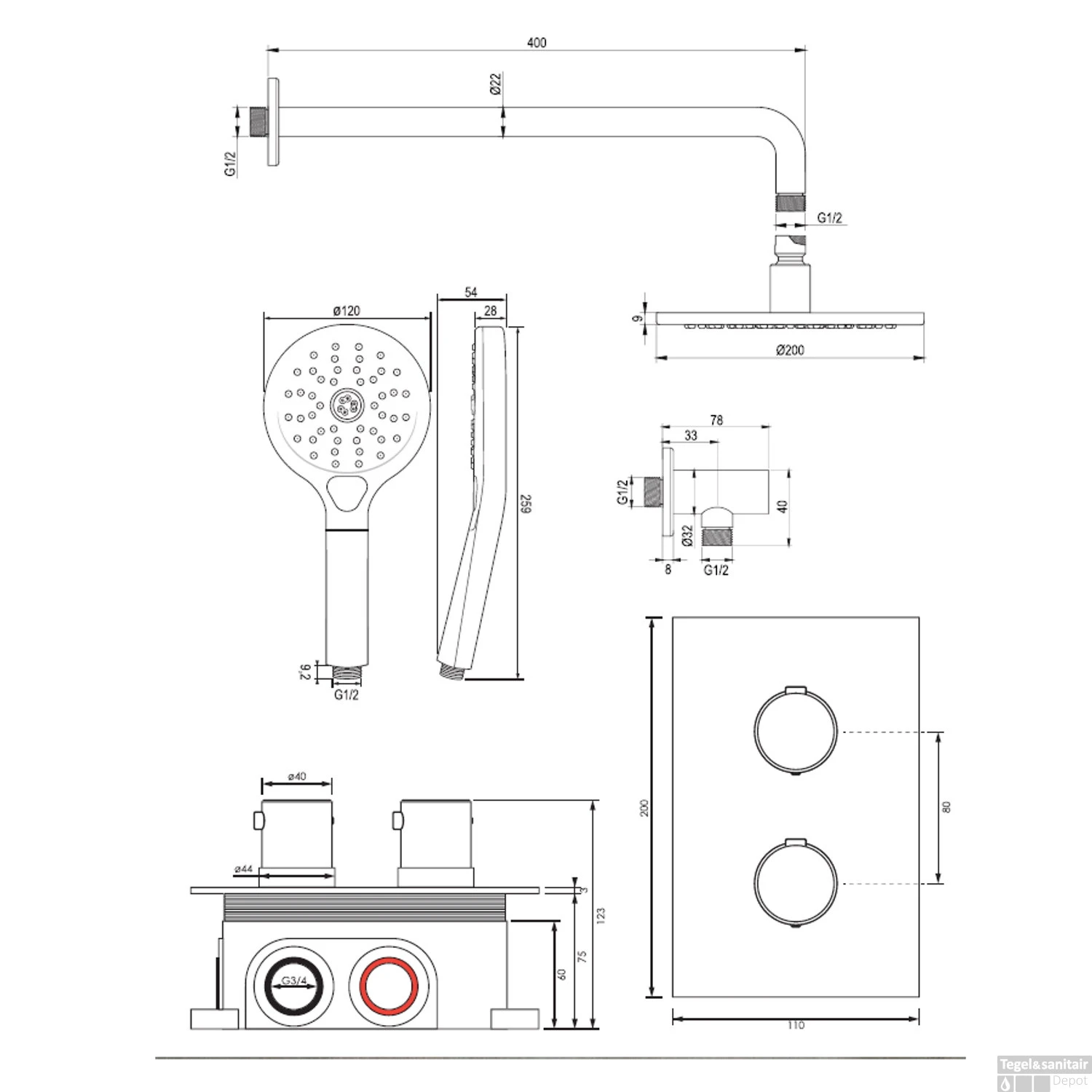 De set bestaat uit een inbouwthermostaat, een afbouw deel van de thermostaat kraan, een wandarm, een hoofddouche met een diameter van 20 cm, een handdouche inclusief wandarm en doucheslang. De thermostaatkraan, met 3/4” aansluiting, is eenvoudig te bedienen door de twee knoppen. Met de onderste knop kunt u eenvoudig de temperatuur van het water instellen. De thermostaat beschikt over een kinderbeveiliging bij 38 graden, waardoor u nooit per ongeluk onder een kokend hete douche zat staan. met de bovenste knop bepaalt u de gewenste douchstand en kunt u switchen tussen de hoofd- en handdouche.