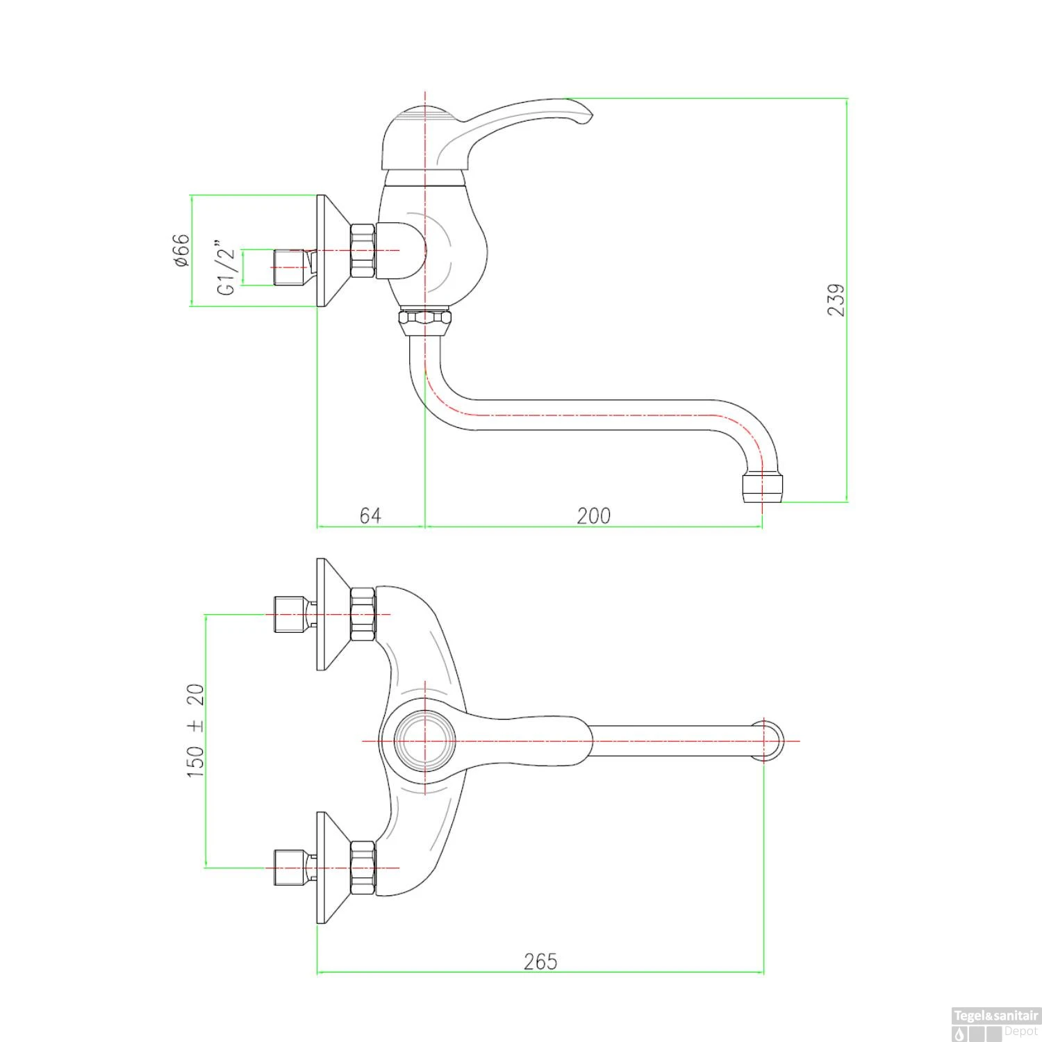 De sierlijke uitloop heeft een lengte van 20 cm. De mengkraan is voorzien van een 1/2 inch aansluiting. De wastafelkraan dient aan de wand bevestigd te worden en wordt exclusief waste geleverd. De hart-op-hart afstand van dit artikel bedraagt 15 cm met een speling van 2 cm.