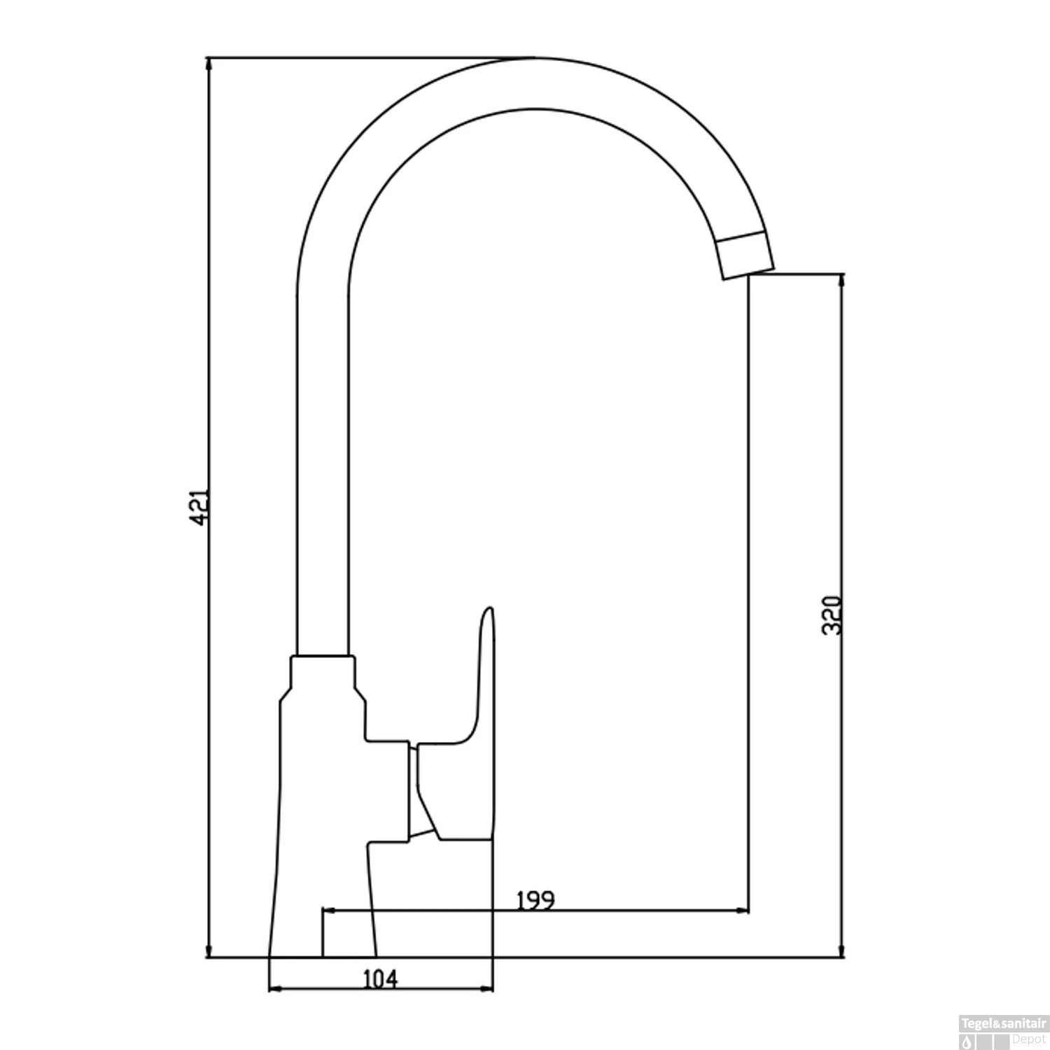 De mengkraan heeft een hoogte van 42.1 cm en een breedte van 10.4 cm. De kraan is 19.9 cm diep.