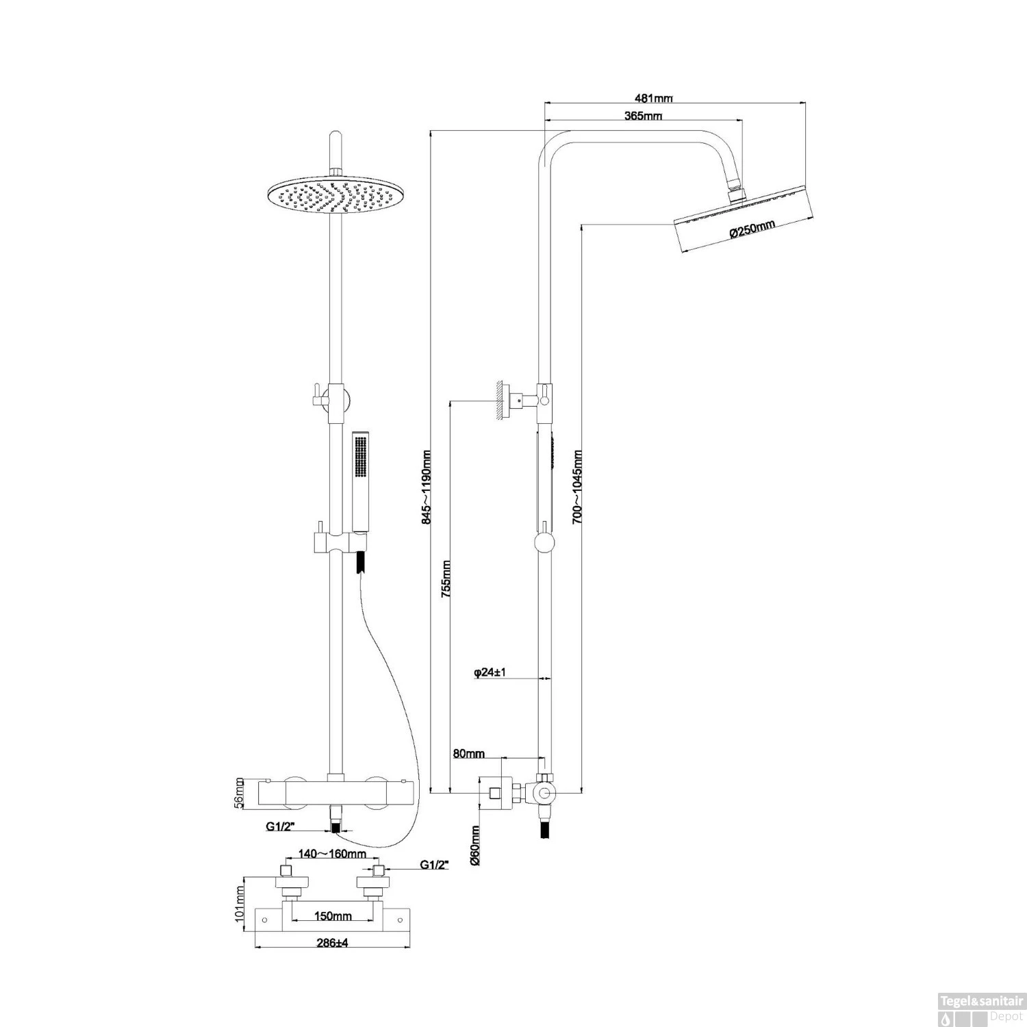 De glijstang is in hoogte verstelbaar van 78,8 tot en met 119 cm. De hoogte van de uitloop kent een verstelbaarheid van 61,3 tot en met 101,5 cm, zodat u deze regendouche volledig naar wens in kunt stellen. De thermostaatkraan beschikt over een hart-op-hart maat van 15 cm en een 1/2”-aansluiting: u dient hier dus rekening mee te houden tijdens het doen van uw aankoop en tijdens de montage!