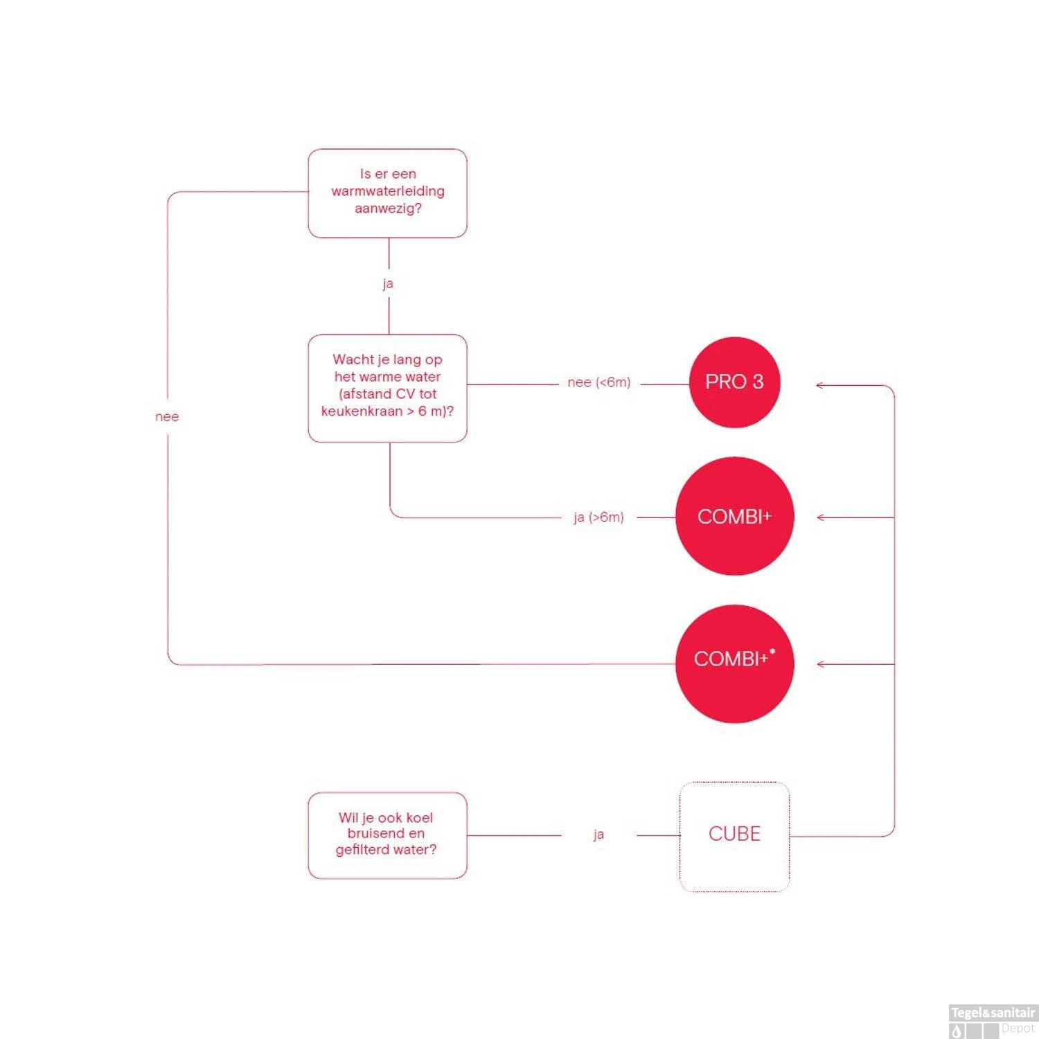 De COMBI+ is aangesloten op zowel de koud- als de warmwaterleiding. Net als de ‘gewone’ COMBI rekent hij af met het lange wachten op warm water en de verspilling van drinkwater. Bovendien heb je met de COMBI+ niet alleen kokend water maar ook onbeperkt warm water uit de keukenmengkraan.