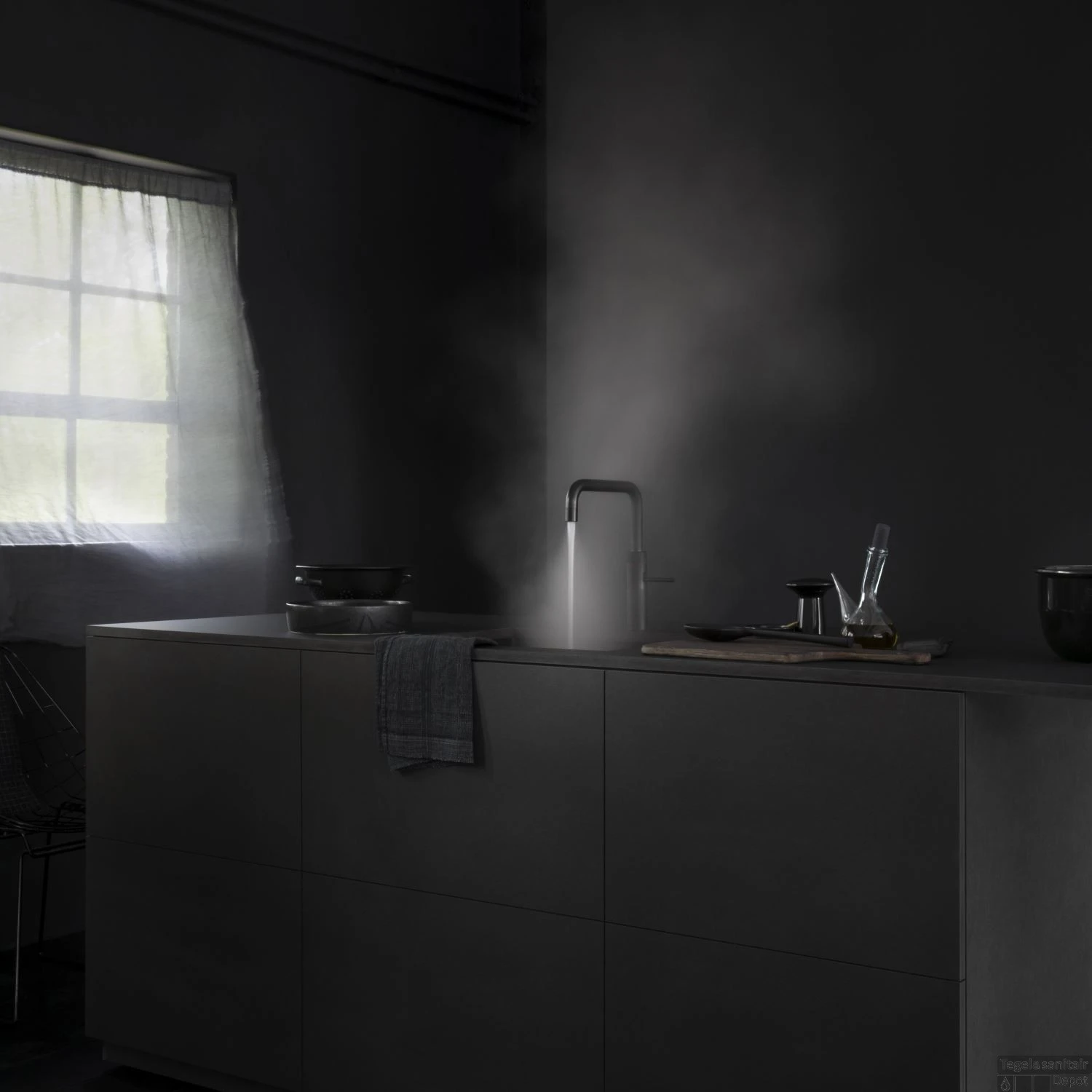 Met de greep stelt u eenvoudig een koude of warme temperatuur in. Met de speciale dubbel-druk-draai bedieningsknop bedient u de kokend water functie van de kraan. Verder stroomt het kokende water niet in een massieve straal uit de kraan, maar in de vorm van kleine druppeltjes. De uitloop van de kraan is dubbelwandig. Hierdoor kunt u de uitloop veilig aanraken.