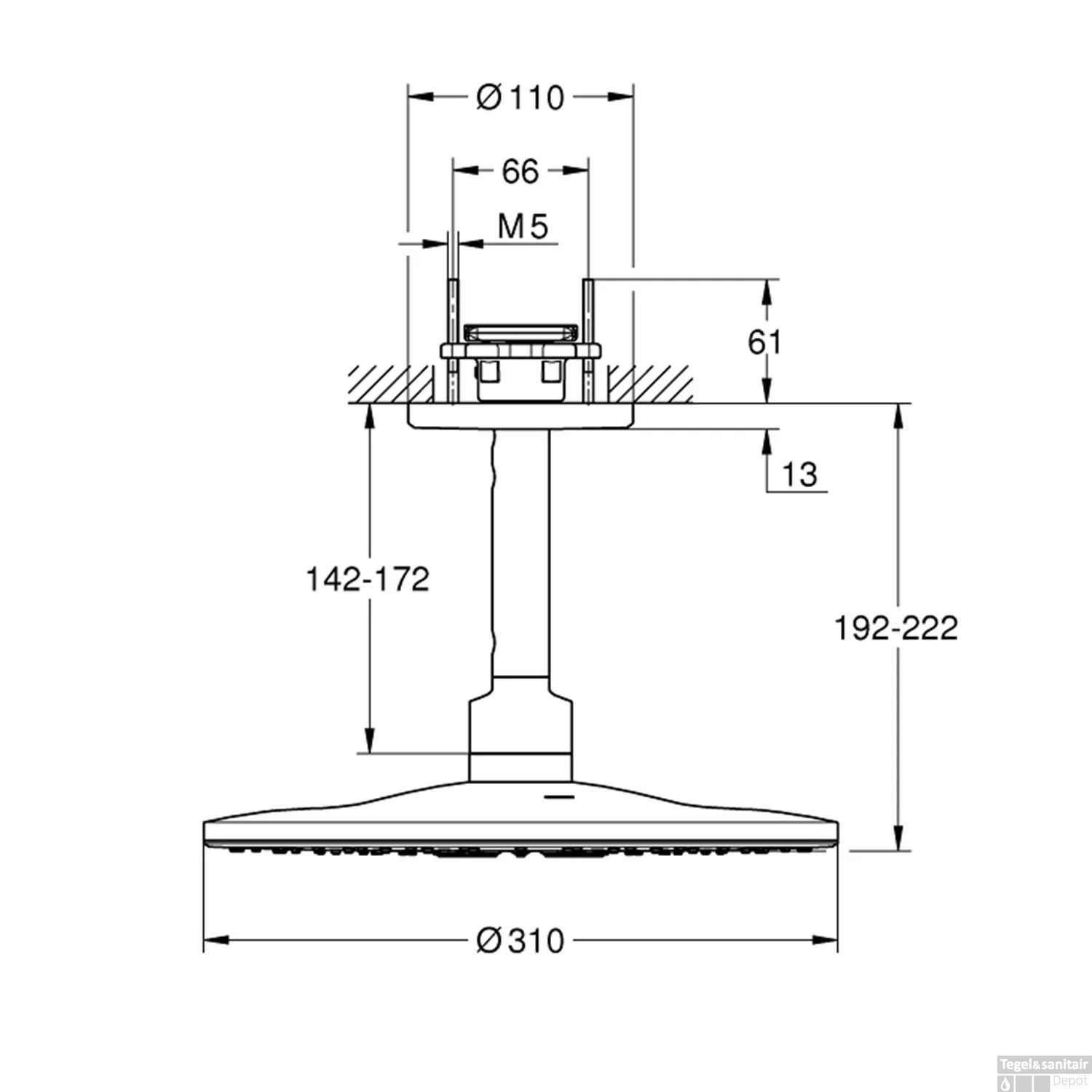 De hoofddouche heeft een diameter van 31 cm en de plafondarm is 18.5 cm lang. Maak uw badkamer compleet met andere producten van Grohe in de kleur Supersteel.