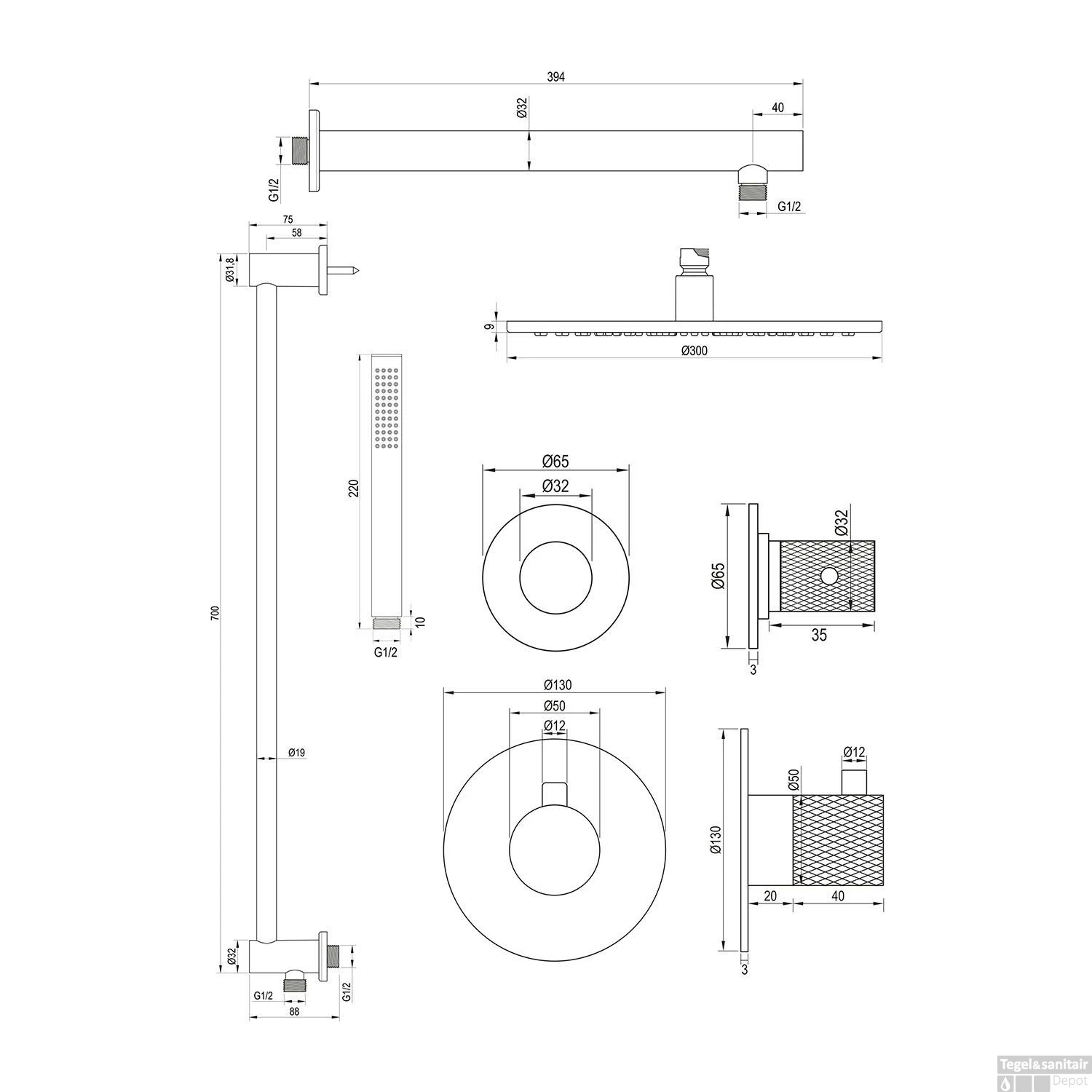 Specificaties Regendoucheset Inbouw Brauer Brushed Carving Thermostatisch 30cm met Wandarm, Glijstang en Handdouche Staaf Losse Stopkranen Geborsteld RVS: