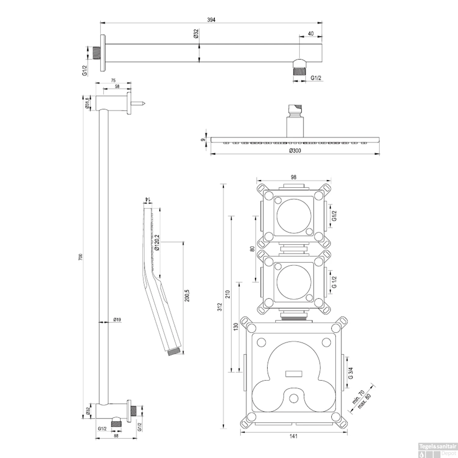 Specificaties Regendoucheset Inbouw Brauer Gold Edition Thermostatisch 30cm met Wandarm, Glijstang en Handdouche 3-Standen Losse Stopkranen Geborsteld Goud: