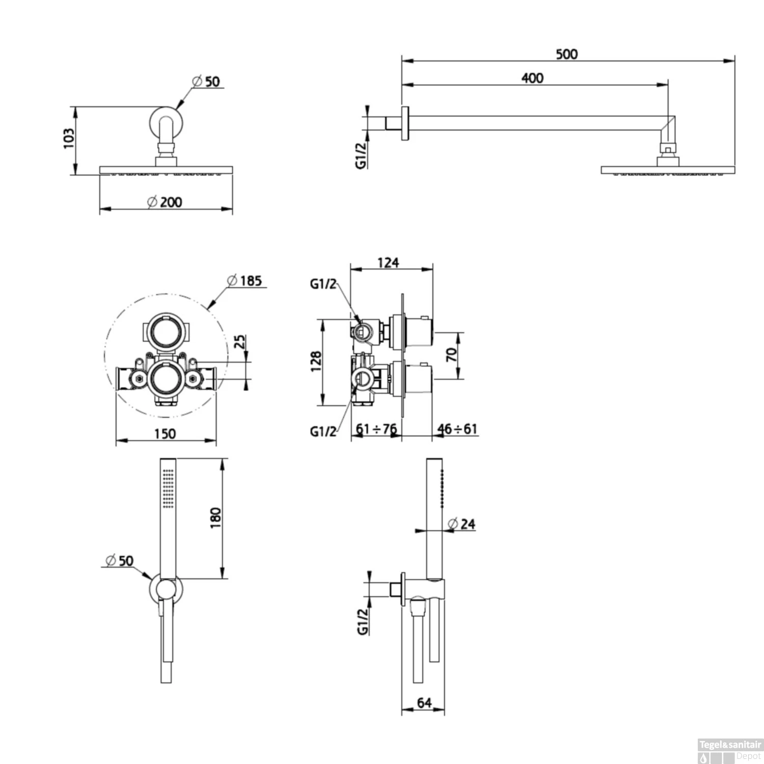 De regendouche van deze set heeft een ronde hoofddouche met een diameter van 20 cm, terwijl de lengte van de uitloop 50 cm bedraagt. De set bestaat verder uit handdouche met een lengte van 18 cm en een Vierkant inbouwdeel. Het inbouwdeel bestaat uit twee knoppen waarmee u de temperatuur bepaalt en de kraan aan- en uitschakelt.