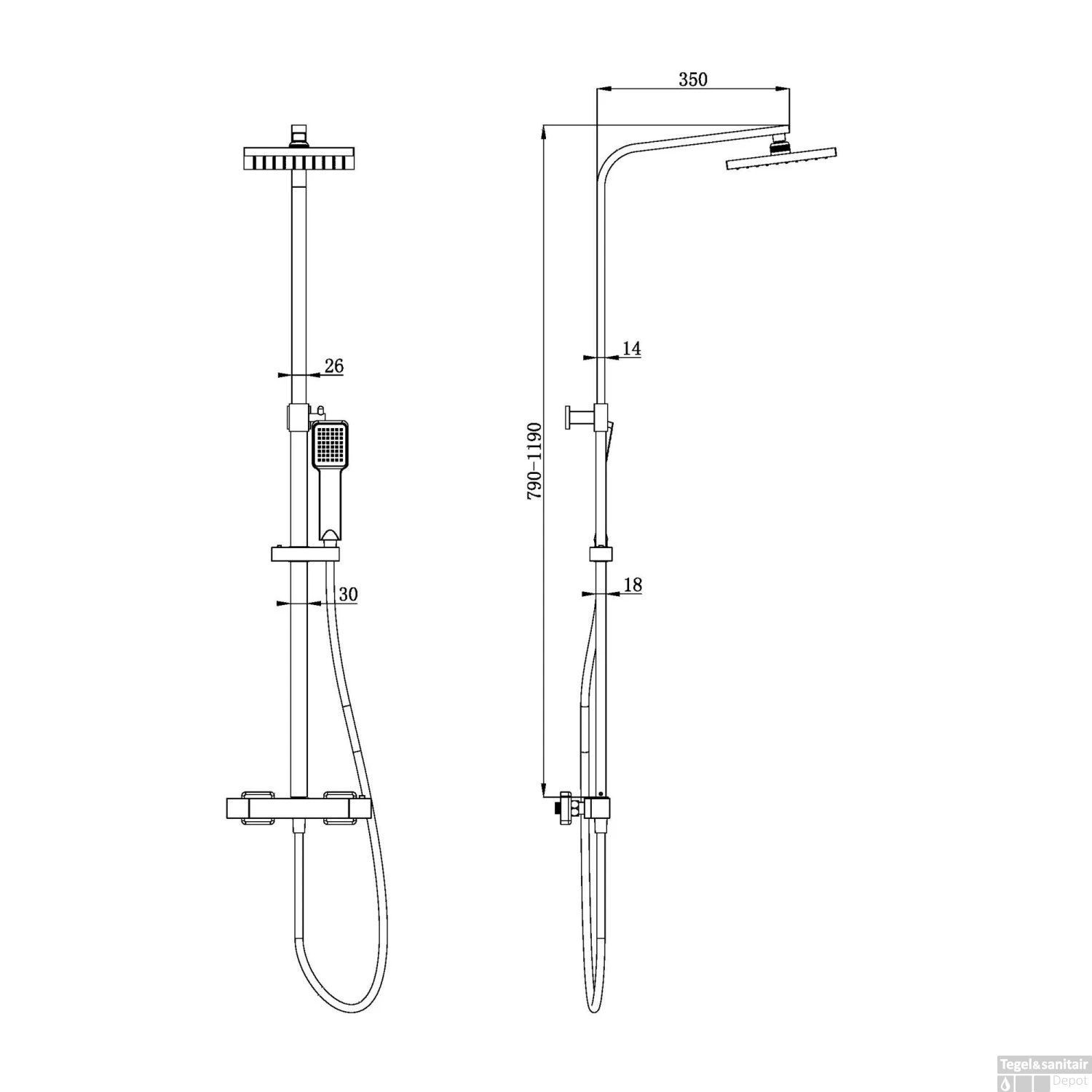 De regendouchekop heeft vierkante vorm en de handdouche is rechthoekig. Verder heeft de regendouche een prachtige zwarte afwerking. De glijstang is verstelbaar tussen 79 cm en 119 cm. De uitloop heeft een diepte van 35 cm.
