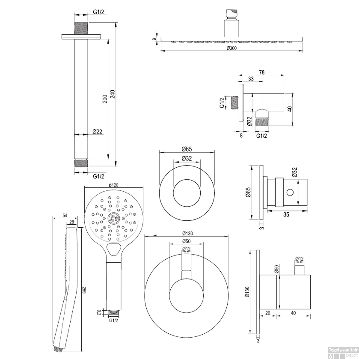 Specificaties Thermostatisch Inbouwdoucheset Brauer Copper 30cm Hoofddouche Plafondarm 3 Standen Handdouche Koper: