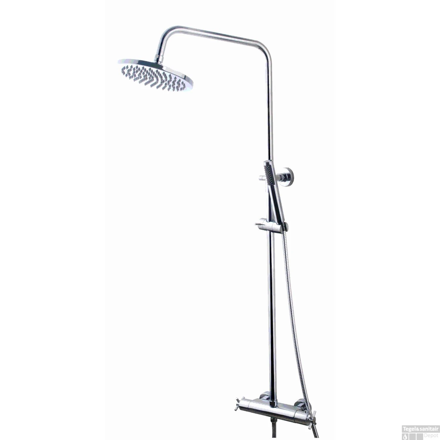 Een elegante moderne douche thermostaatkraan van Wiesbaden. Heeft een verstelbare douchestang waarmee uw eigen gewenste hoogte kunt instellen. De kraan is voorzien van aan Chromen douchekop van 20x 20 cm. De doucheslang met handdouche heeft ene lengte van 150 cm.