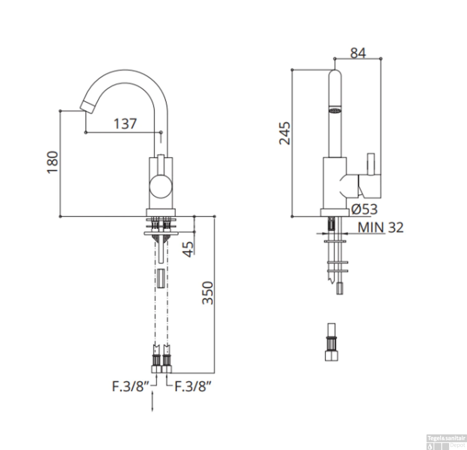De kraan is 24.5 cm hoog en de hoogte tot aan de uitloop is 18 cm. De lengte van de uitloop en daarmee ook de diepte van de kraan is 13.7 cm. De kraan komt niet met waste.