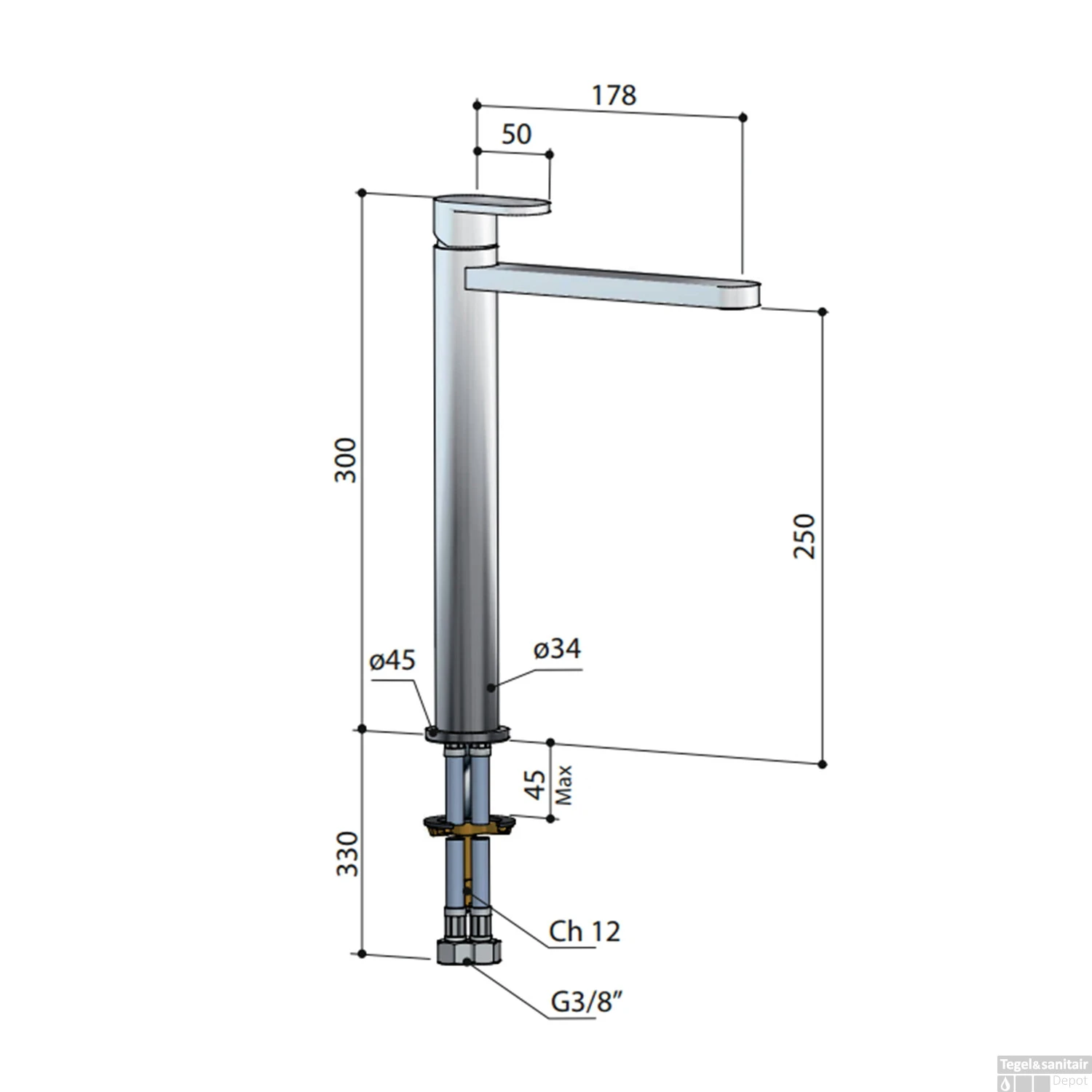 - Hoogte kraan: 30 cm