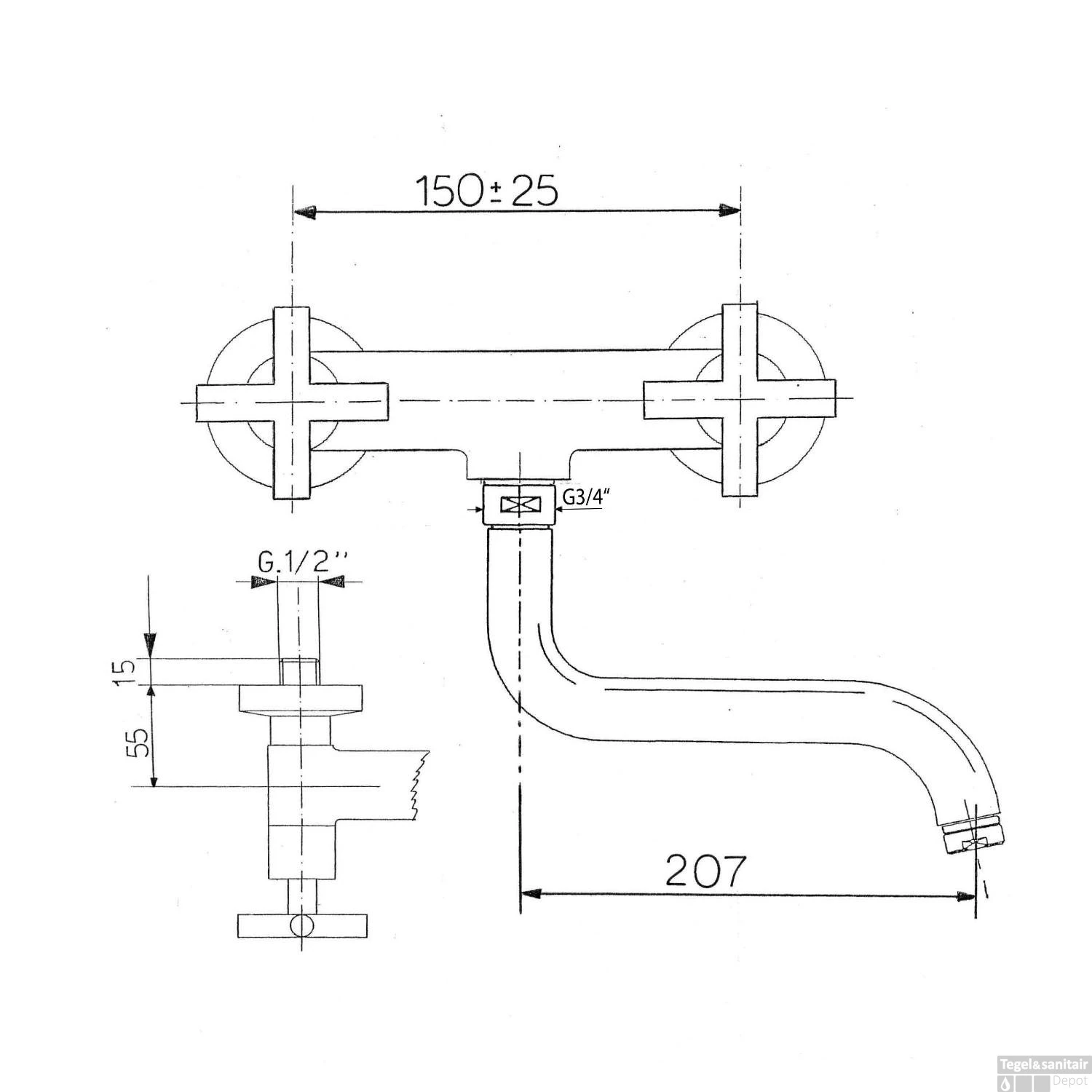 De uitloop heeft een lengte van 20.7 cm. De mengkraan is voorzien van een 1/2 inch aansluiting. De wastafelkraan dient aan de wand bevestigd te worden en wordt exclusief waste geleverd. De hart-op-hart afstand van dit artikel bedraagt 15 cm, met een speling van 2.5 cm.