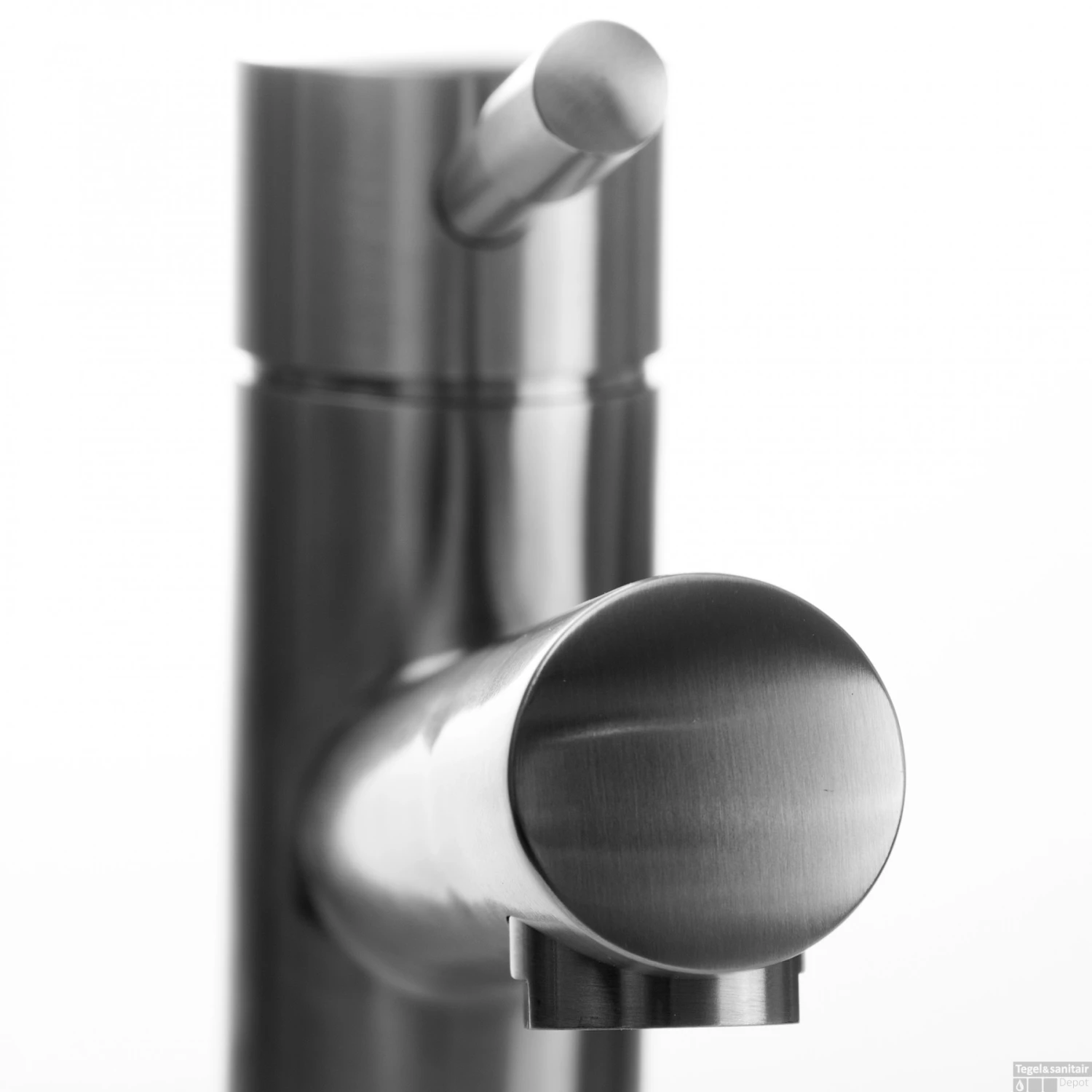 De twee kranen voor warm en koud water zijn hier vervangen door een mechaniek waarin de doorstroming van het koude en warme water met een hefboom wordt bedient. Door de hendel aan de bovenkant horizontaal te bewegen reguleert u de verandering van de temperatuur van het water terwijl de verticale beweging de stroomsnelheid bepaalt. Omlaag om de kraan te sluiten, omhoog om hem te openen.
