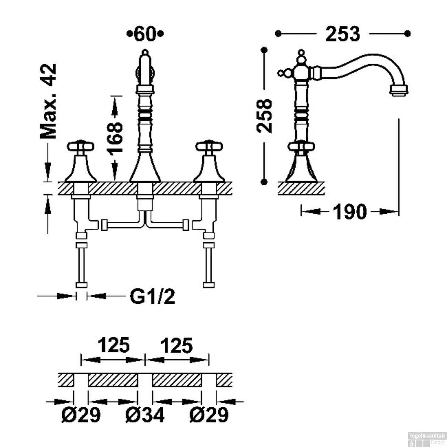 De totale hoogte van de kraan is 25.8 cm en hij is 25.3 cm diep. Omdat het een mengkraan is, bepaald u zelf de temperatuur door het warme en koude water te mengen. Om de kraan aan te sluiten is er een kraangat van 3,4 cm doorsnede. De gaten van de grepen zijn iets kleiner, namelijk 2.9 cm.