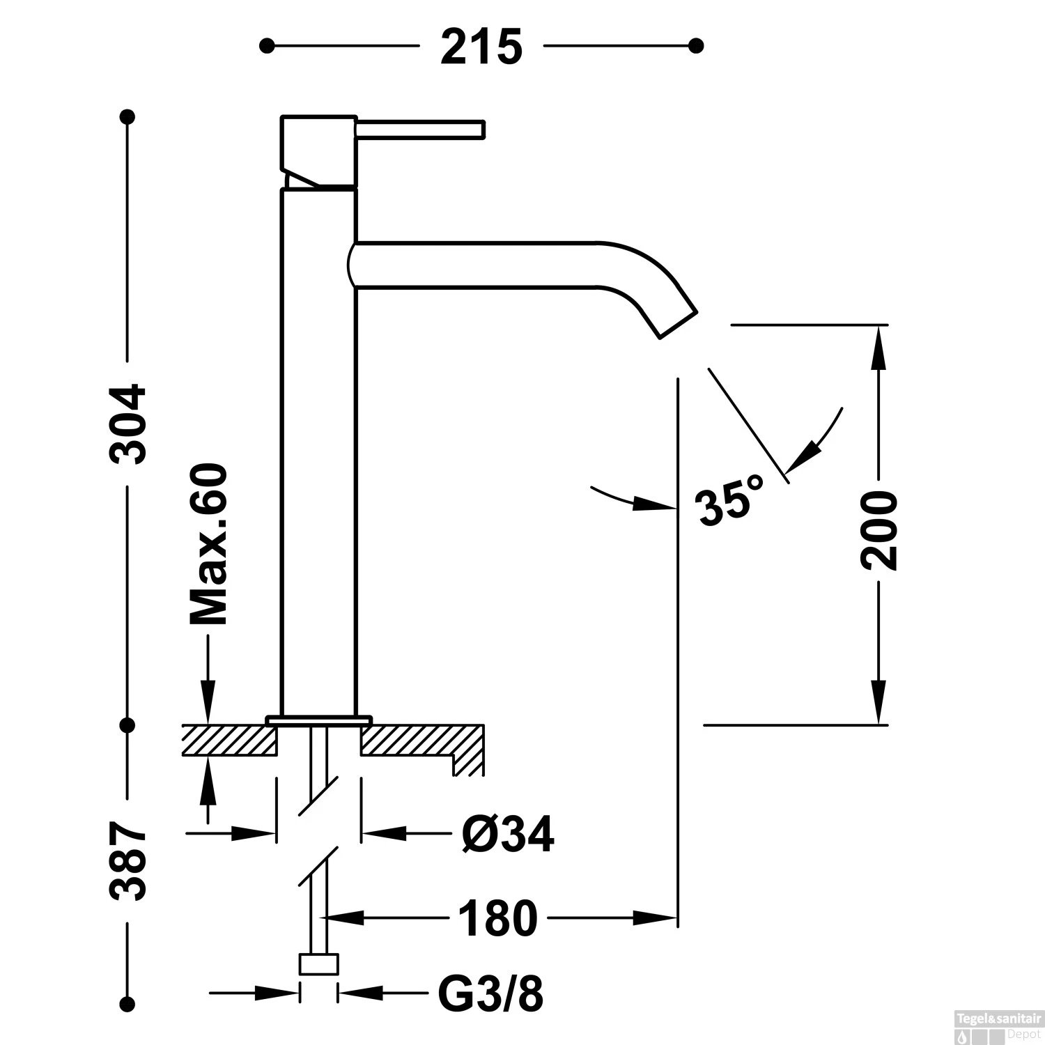 De kraan heeft een hoogte van 30,4 cm en een diepte van 21,5 cm. De uitloop is 20 cm hoog en 18 cm lang. De kraan heeft een 3/8″ aansluiting. Het binnenwerk van de kraan is voorzien van keramische schijven. Dit zorgt ervoor dat de hendel soepel blijft bewegen en uw kraan langer meegaat. Hij is van messing in de kleur chroom.